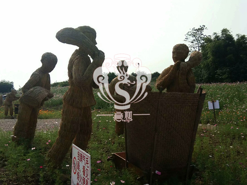 现在的精致稻草人艺术通常是由专业美术老师的造型放样,然后由焊工师傅焊接出立体造型造型,然后以稻草或者稻草绳为材料编捆制作而成。