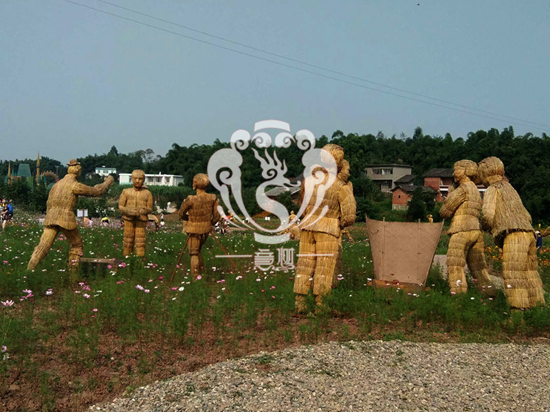 现在的精致稻草人艺术通常是由专业美术老师的造型放样,然后由焊工师傅焊接出立体造型造型,然后以稻草或者稻草绳为材料编捆制作而成。