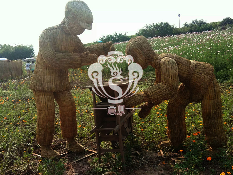 现在的精致稻草人艺术通常是由专业美术老师的造型放样,然后由焊工师傅焊接出立体造型造型,然后以稻草或者稻草绳为材料编捆制作而成。
