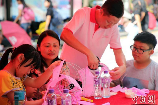 6月25日,“庆祝香港特别行政区成立20周年纪念--华灯闪烁耀香江”大型传统扎作花灯展暨文化传统亲子工作坊在中环举行,展出传统民间扎作花灯。图为市民在学习紮作传统花灯。